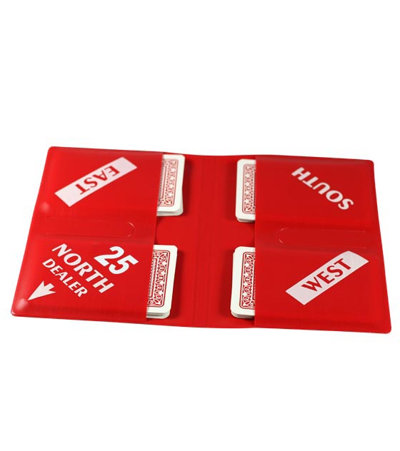 Every wallet has a different number, different dealer position and different vulnerability, in accordance with the duplicate bridge rules. Inside the wallet there are four pockets for the 13 cards of each player. The wallets are used to keep the dealt Bridge hand in the same order and position, and to allow several pairs to play the same hands.